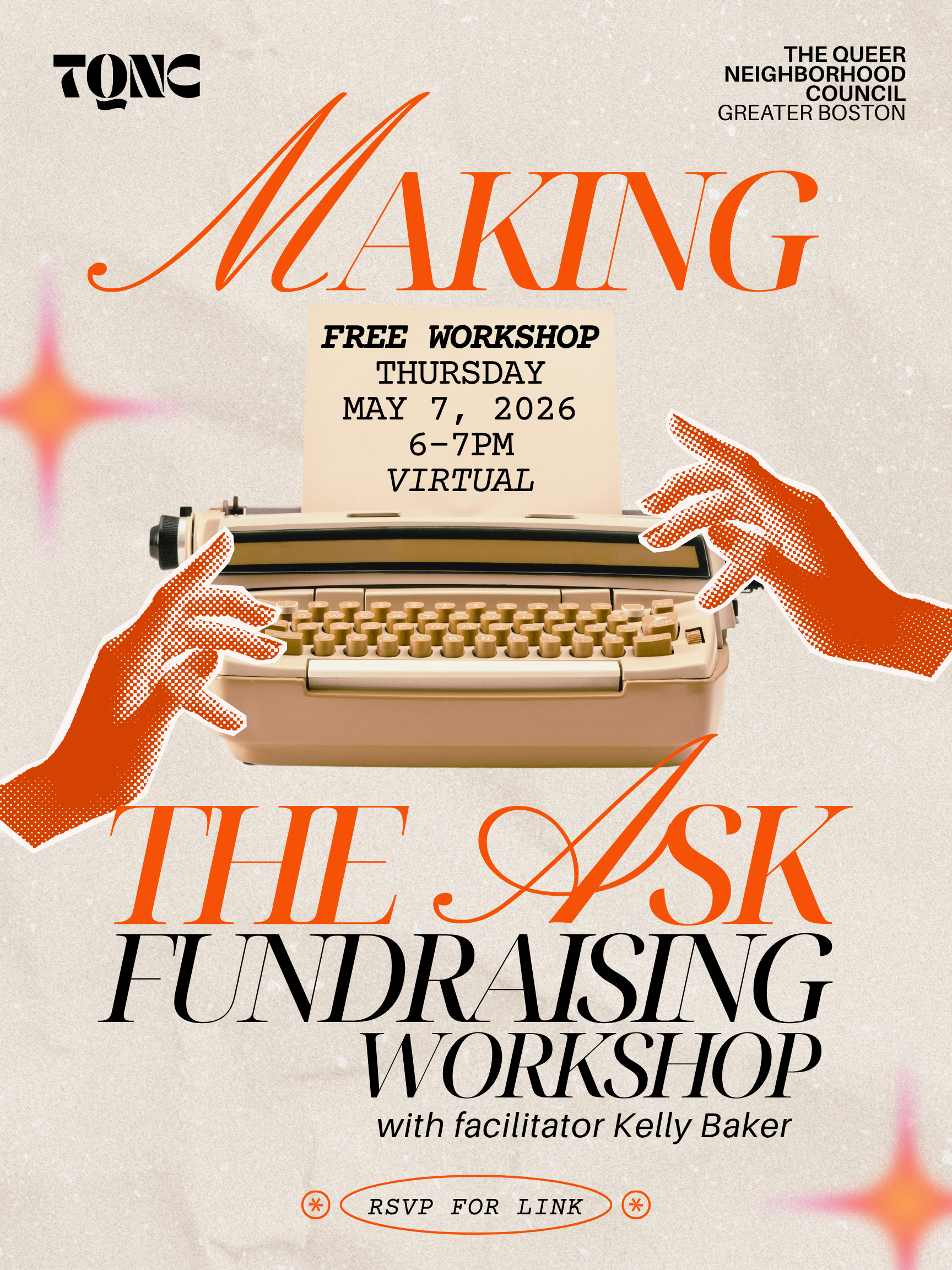 TQNC is a grassroots nonprofit fostering queer joy, advocacy, and arts for Greater Boston’s LGBTQIA+ and ally community. TQNC hosts queer community events where we can safely exist as our whole selves, advocates for our queer community, and provides support services for queer community members facing threats to their basic physical and mental health. Find us on Instagram & Bluesky @tqncboston or TQNC.org.